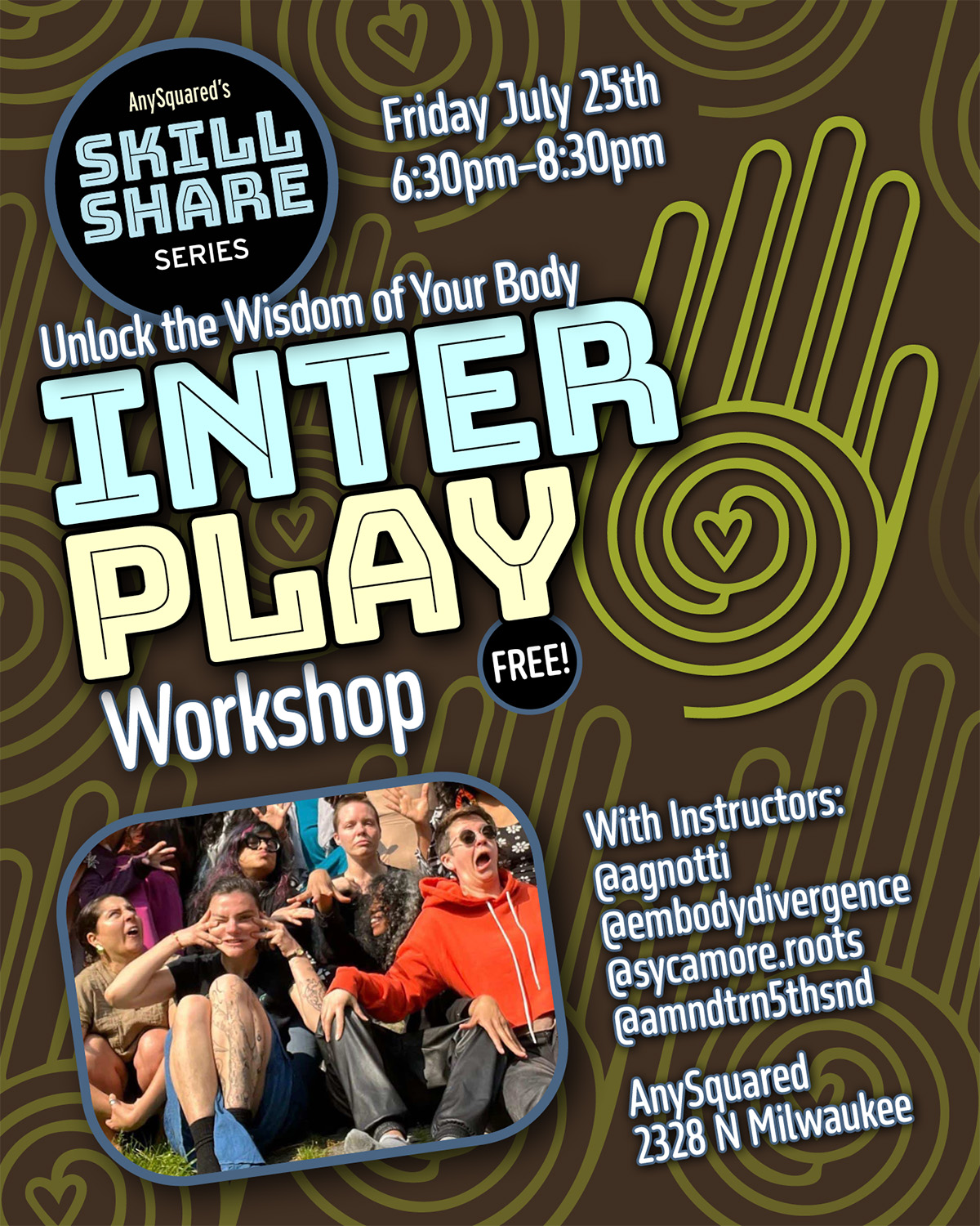 Interplay is an active and creative approach to unlocking the wisdom of the body. we do that by playing with our stories, sounds, and movement. With Instructors: @agnotti • @embodydivergence • @sycamore.roots • @amndtrn5thsnd. This workshop part of AnySquared’s SkillShare Series